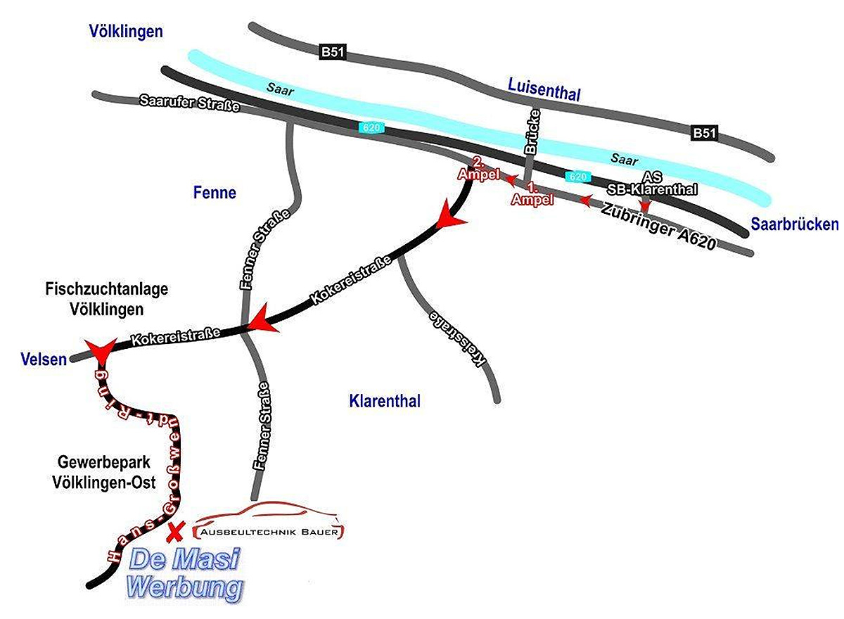 AS Saarbrücken Klarenthal, an der 2. Ampel links, ca. 1.4Km geradeaus, links Richtung Gewerbepark Völklingen-Ost